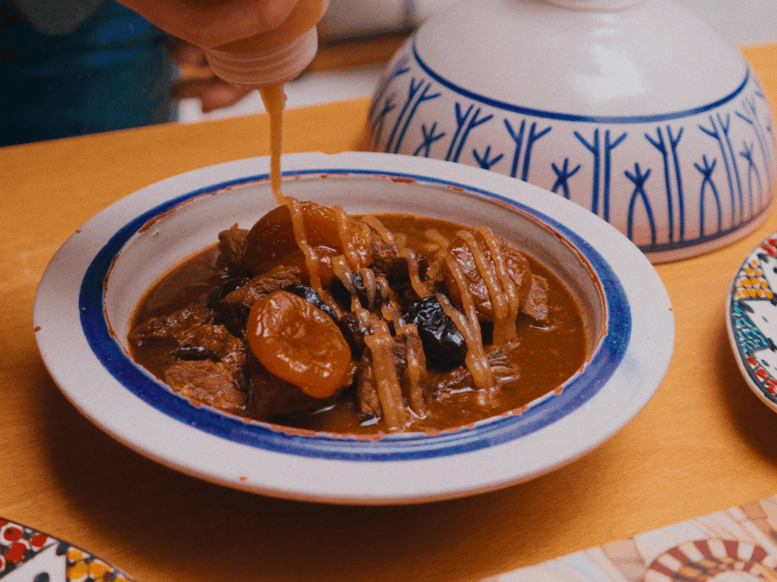Plato salado: Tajine de entrecôte de vaca, crema de membrillo y frutos secos.